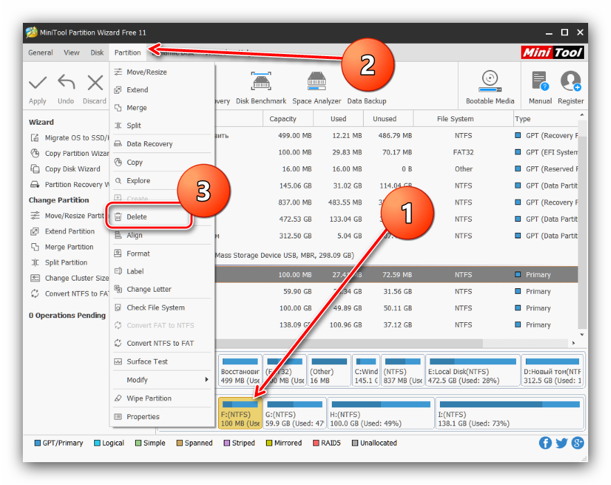 Если требуется сменить формат таблицы разделов на системном носителе, проделать это у вас описанным выше методом не получится, но есть небольшая хитрость. На шаге 2 найдите раздел загрузчика на нужном диске – обычно он имеет объём от 100 до 500 Мб и расположен в начале строки с разделами. Выделите пространство загрузчика, затем воспользуйтесь пунктом меню «Partition», в котором выберите опцию «Delete».