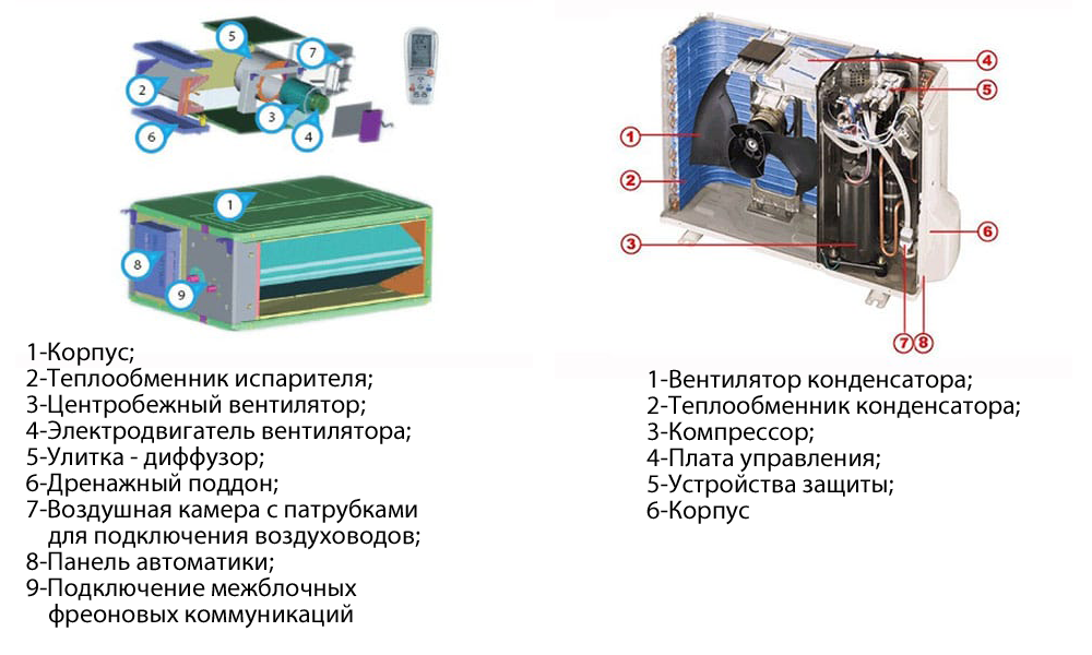 Как и любая сплит-система, канальная состоит из двух модулей: компрессорно-конденсаторного (наружного) и испарительного (внутреннего), которые сообщаются между собой медным трубопроводом с фреоном и электропроводами. Внешний модуль устанавливают снаружи здания, а монтаж комнатного предполагает несколько вариантов размещения: