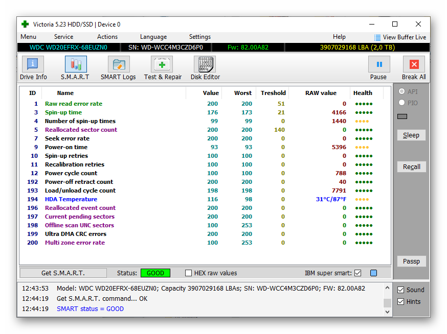 Так S.M.A.R.T HDD выглядит в программе Hard Disk Sentinel: