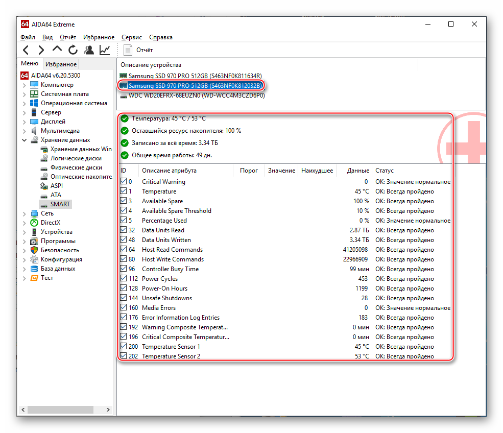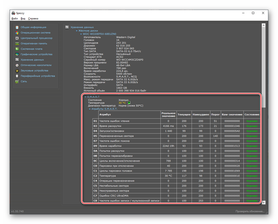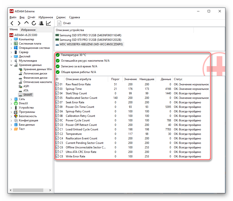 Просмотрите данные системы и «Атрибуты S.M.A.R.T.» по различным параметрам.