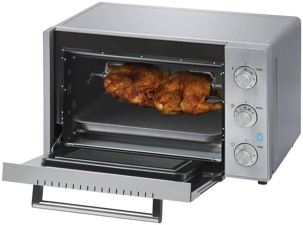 Немецкая печь имеет хорошие отзывы у покупателей, хотя ее цена значительно выше, чем у моделей предыдущей категории. Ее объем – 28 л, мощность – 1,4 кВт. Устройство оснащено антипригарным внутренним покрытием и поддоном для крошек.