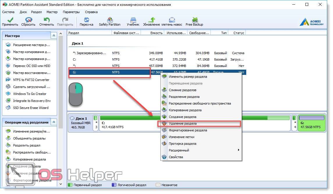 - Правой кнопкой мыши кликните по диску (если он не скрытый), который хотите приплюсовать к основному. В появившемся контекстном меню выберите «Удалить раздел». В нашем примере — это диск «G».
