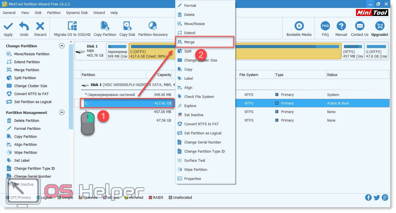 - Правой кнопкой мыши кликните по главному разделу, к которому хотите приплюсовать другой. В появившемся контекстном меню выберите «Merge».