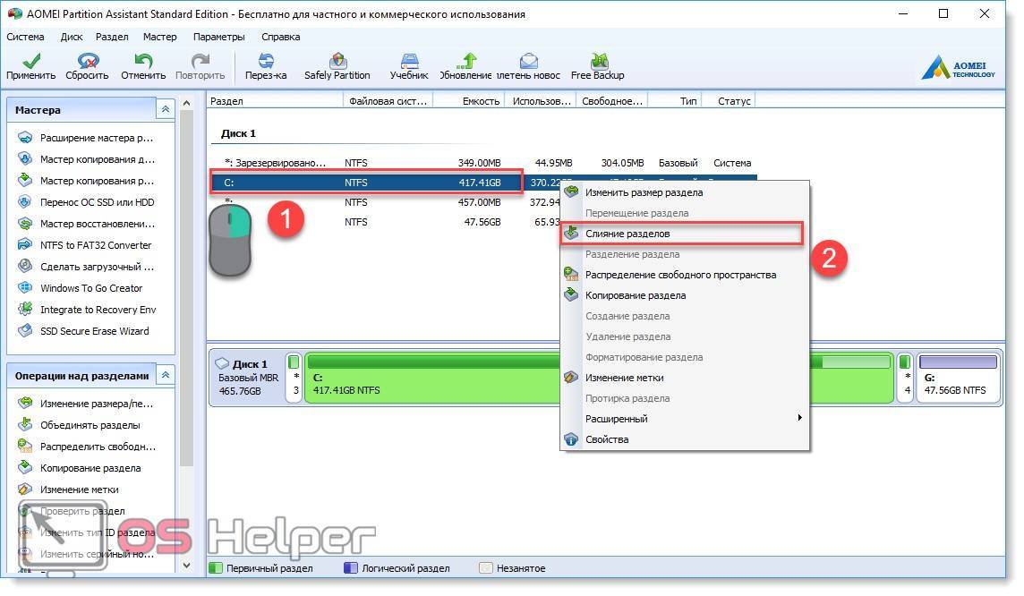 - Для этого кликните по «C» правой кнопкой мыши и в контекстном меню выберите «Слияние разделов».