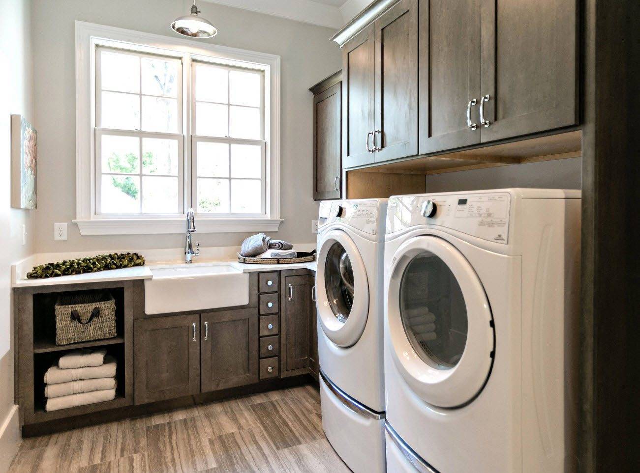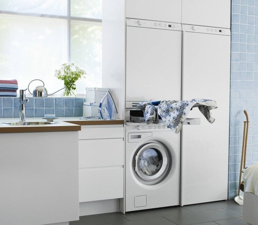 При этом ванная комната, благодаря отсутствию стирального агрегата приобретает больше простора. Фасадную часть агрегата закрывает дверца, выполненная в соответствии со стилем помещения. Таким образом, сохраняется общее стилистическое направление, в котором оформлено помещение.