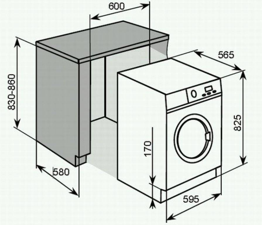 Установка проводится с учетом размерных величин тумбы и предусматривает достаточный зазор между задними стенками тумбы и машинки для расположения шланга. Величину высоты стандартного типа столешницы приняли равной 85 см. Величина высоты стирального агрегата, который будет под нее устанавливаться, доходит до 82 см. Унифицированное значение ширины встроенной техники, если брать для примеров различные модели, от 59,5 до 60 см.