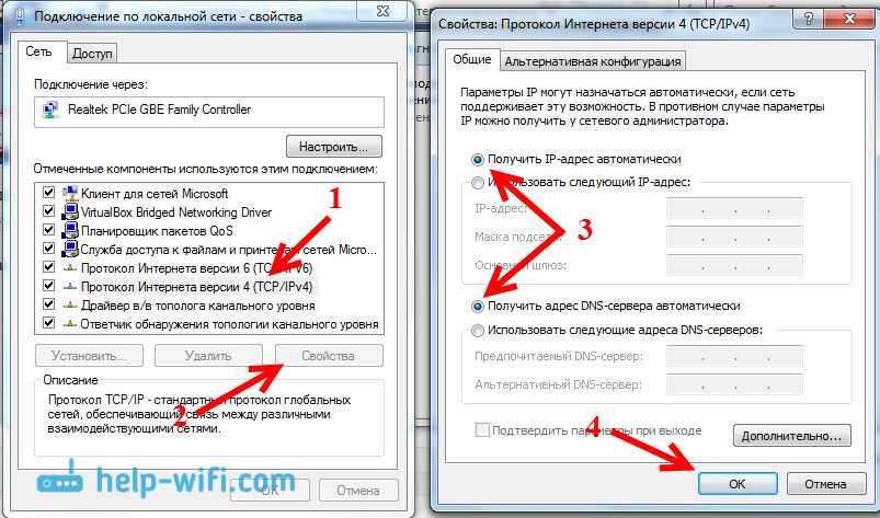 Здесь однократным кликом выбирается «Протокол Интернета версии 4…» и активируется ставшая доступной кнопка «Свойства». Положение регуляторов необходимо перевести в следующий вид и нажать «OK».