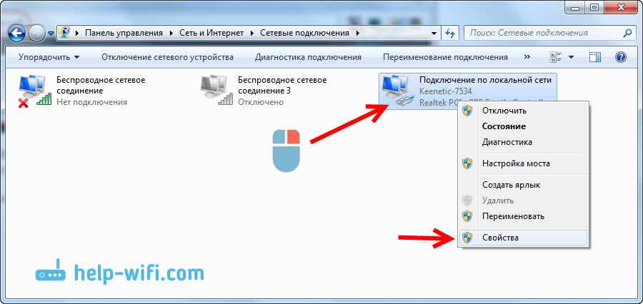 Нажимаем правой кнопкой мыши на адаптер, через который вы подключены к роутеру. Если по сетевому кабелю, то это ‘Подключение по локальной сети’ (В Windows 10 – Ethernet). А если по Wi-Fi подключаетесь, то нажимаем на ‘Беспроводный адаптер’, и выбираем ‘Свойства’.