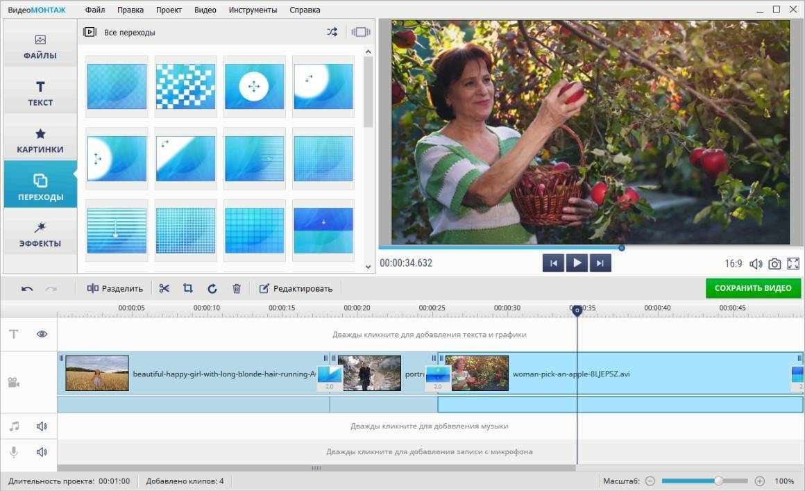 Хотите смонтировать ролик с нуля или улучшить качество существующего с помощью нашего ПО? Создайте проект, добавьте файлы и приступайте к творчеству. Обязательно загляните во вкладки «Титры», «Футажи» и «Клипарт». Там вы найдете много полезных материалов и шаблонов, которые помогут дооформить задумку.