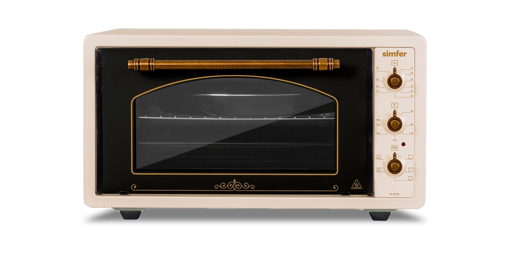 Следующая модель из того же ценового сегмента – Simfer M4579. Модель выделяется дизайном – она выполнена в ретростиле, оснащена оригинальными по форме ручками бронзового цвета, интересно очерченным стеклом на дверце. Двойное стекло, внутренняя изоляция и контурный уплотнитель обеспечивают безопасность при работе печки, сокращают время готовки и снижают энергопотребление. Ручка для открывания двери оснащена защитой от нагревания для полностью безопасной эксплуатации. Печка выделяется на фоне описанных чуть большими габаритами и огромным внутренним пространством – 45 л.