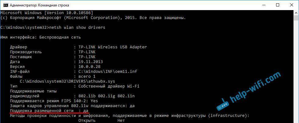 Если хотите, то командой netsh wlan show drivers можно проверить, поддерживает ли ваш беспроводной адаптер запуск виртуальной Wi-Fi сети. Просто в командной строке выполните команду. В результатах найдите пункт “Поддержка размещенной сети“. Напротив должно быть “да”.