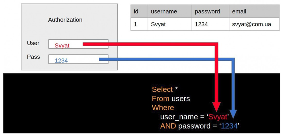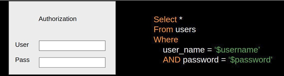 Итак, тут мы видим форму, при заполнении которой введенные данные будут отправлены в SQL-запрос, и он вытянет нам ответ из базы данных. Если такой юзер есть в базе данных, то нас авторизует. Если нет, то нам скажет: сорян, зарегайся. То, что мы будем вводить в поле , передается в переменную , а то, что введут в поле , передается в переменную нашего SQL-запроса. А теперь рассмотрим то, что будет происходить при вводе значений в эти поля.