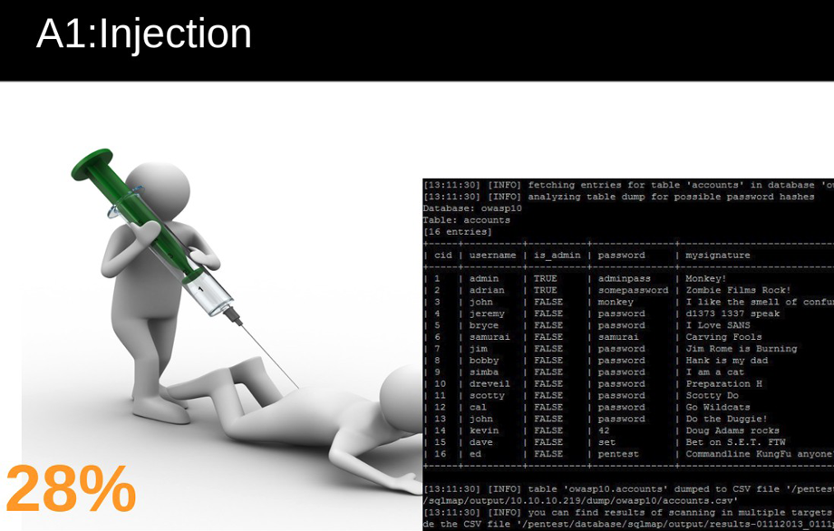 А теперь перейдем к первой уязвимости из рейтинга OWASP Top 10 — к Injection. По статистике, ею заражено 28% компаний… Я рассматриваю ее позднее, так как эта уязвимость с каждым годом становится все менее распространенной, но остается наиболее критичной из всех, потому что с ее помощью можно увести всю вашу базу данных. Эта уязвимость делится на такие векторы для атаки: