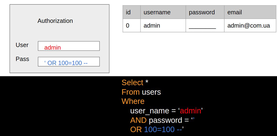 - А выражение из нашего значения говорит серверу: даже если пароль не подошел, все равно прими за , как будто он подошел для тебя, так как является .