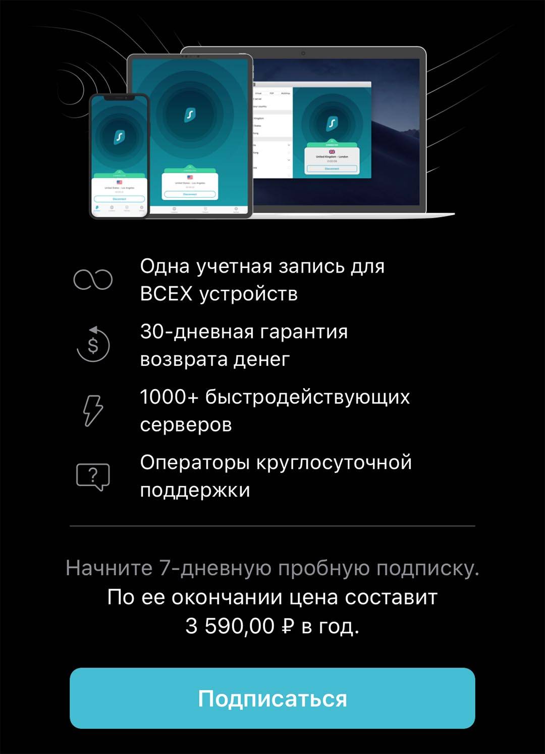 На айфоне вы можете подключить только один тариф: на один год за 3590 рублей с бесплатным семидневным триалом, что является одним из самых дешёвых предложений на рынке.