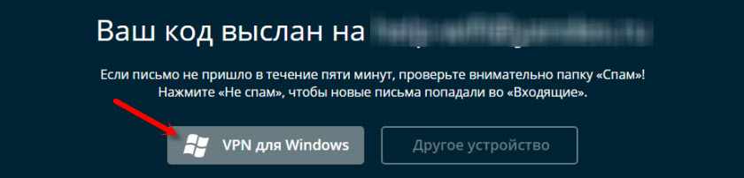 Видим сообщение, что код отправлен. Сразу можем скачать программу для работы через VPN. Для Windows, или других устройств.