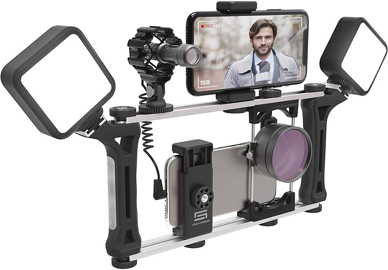 Риг Dreamgrip Evolution Mojo прекрасно подходит для тех, кто использует смартфоны для съемок, в данную систему включены все возможные дополнительные крепления для аксессуаров. Сама конструкция прочная и качественная. Универсальное устройство поставляется совместно с микрофоном shotgun, со светодиодными фонарями в количестве двух штук, двойными ручками, а также держателями зажимов и креплением для объектива. Чтобы еще больше расширить возможности телефона, можно дополнительно приобрести ручки, мониторы и различные световые источники.