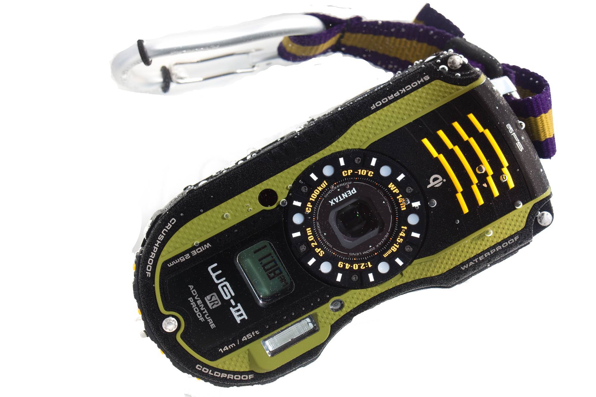 Выпускается в двух вариантах: Pentax WG-3 и Pentax WG-3 GPS. Последняя модель оснащена GPS-навигатором, может проставлять геотеги, стоит на $ 50 дороже. Надежная подводная камера для дайвинга с глубиной погружения до 14 метров. Корпус сделан из толстого, мягкого пластика, что дополнительно предохраняет аппарат от повреждений и протечек.