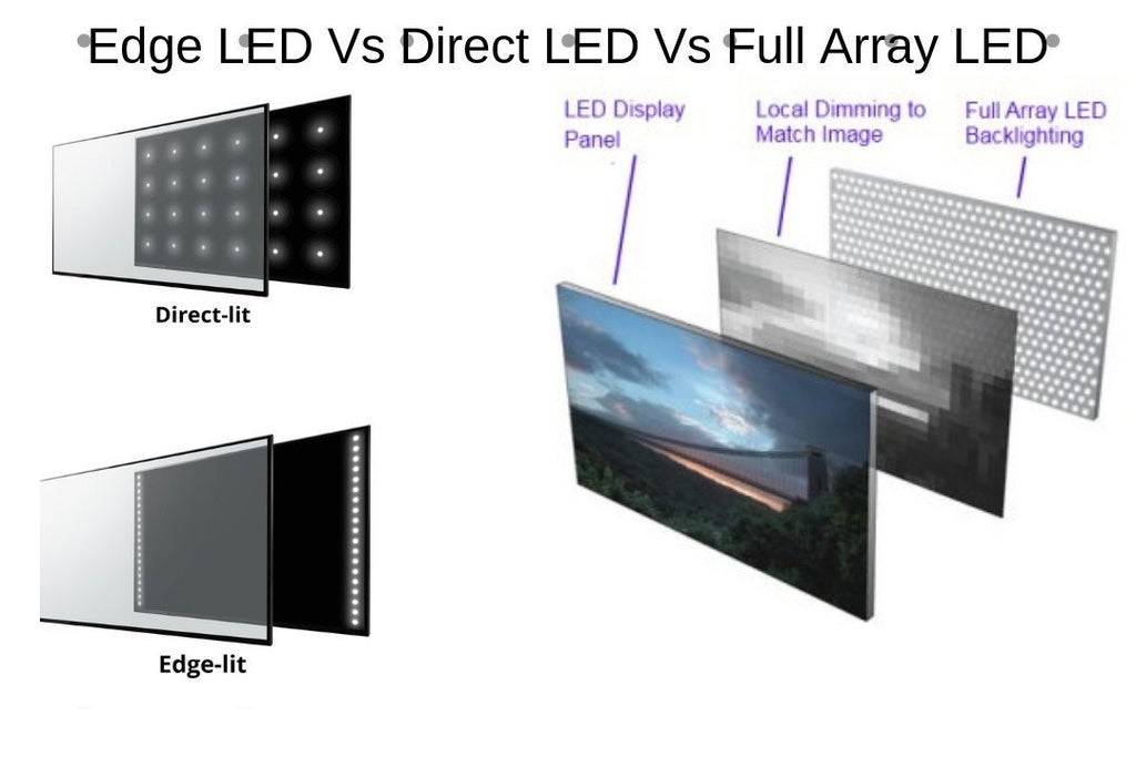 Чем отличаются подсветки Edge-LED, Direct-LED? Главное отличие — в яркости матрицы ТВ в том или ином участке дисплея во время работы в разных режимах демонстрации картинки.