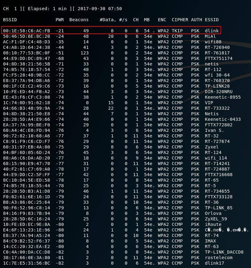 Когда вы увидите в списке сеть, которую хотите атаковать, то остановите программу, для этого нажмите CTRL+c.