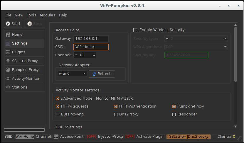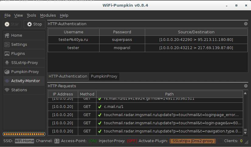 WiFi-Pumpkin (ранее 3vilTwinAttacker) – этот инструмент создаёт мошенническую точку доступа Wi-Fi, якобы для обеспечения беспроводных услуг Интернет, а на самом деле следящую за трафиком. Может использоваться для захвата учётных данных неподозревающего пользователя как перехватом данных, так и фишингом.