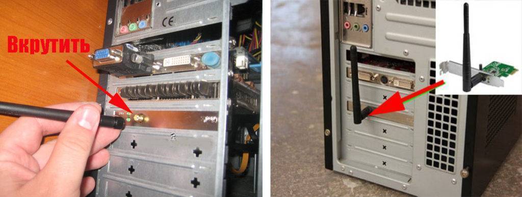 - установить переходник в разъем PCIe, предварительно соединив антенны при помощи соответствующего кабеля и разъемов (при отсутствии кабеля его можно взять из старого ноутбука, откуда был извлечен модуль и припаять к штырьковым антеннам);
