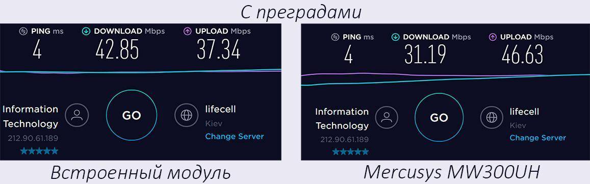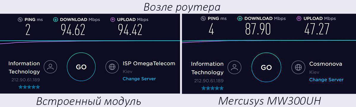 А вот через толстую стену и на расстоянии 5 метров от маршрутизатора — всё уже относительно одинаково. На загрузку и отдачу циферки отличаются так, что где-то выигрывает встроенный в лэптоп модуль, а где-то Mercusys MW300UH.