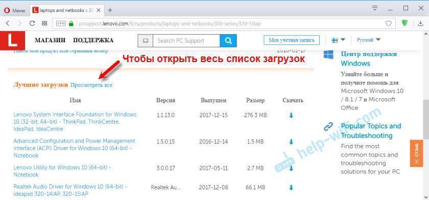 Откроется страничка нашего устройства. Нас интересуют загрузки. Там сразу будут предложены “Лучшие загрузки” среди которых уже можно найти нужный драйвер, или утилиту. Но если нажать на “Просмотреть все”, то откроется полный список с сортировкой по разделам.