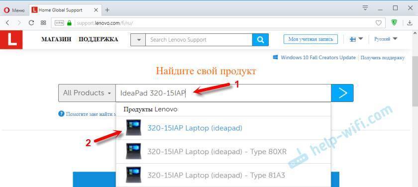 В строке поиска пишем модель своего ноутбука только без “Lenovo”. И выбираем наш вариант из списка.