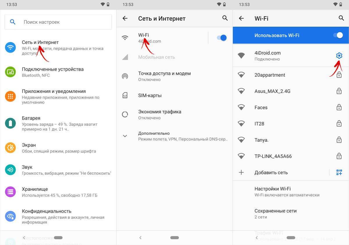 В прошивках, основанных на стоковом Android 10, также реализована функция, позволяющая посмотреть пароль от беспроводной сети, к которой подключено мобильное устройство. Чтобы воспользоваться данной опцией, следует открыть «Настройки», зайти в раздел «Сеть и Интернет» и выбрать подраздел «Wi-Fi».
