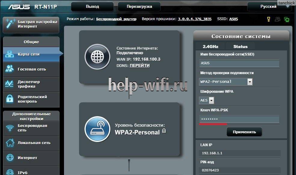В маршрутизаторах ASUS сразу после входа в панель администрирования вы попадаете на страницу, на которой отображается состояние подключения. Эта страница находится на вкладке «Карта сети». Здесь справа расположен пункт «Ключ WPA-PSK», в котором находится пароль к вайфай соединению. Нужно щелкнуть по полю, чтобы посмотреть его.