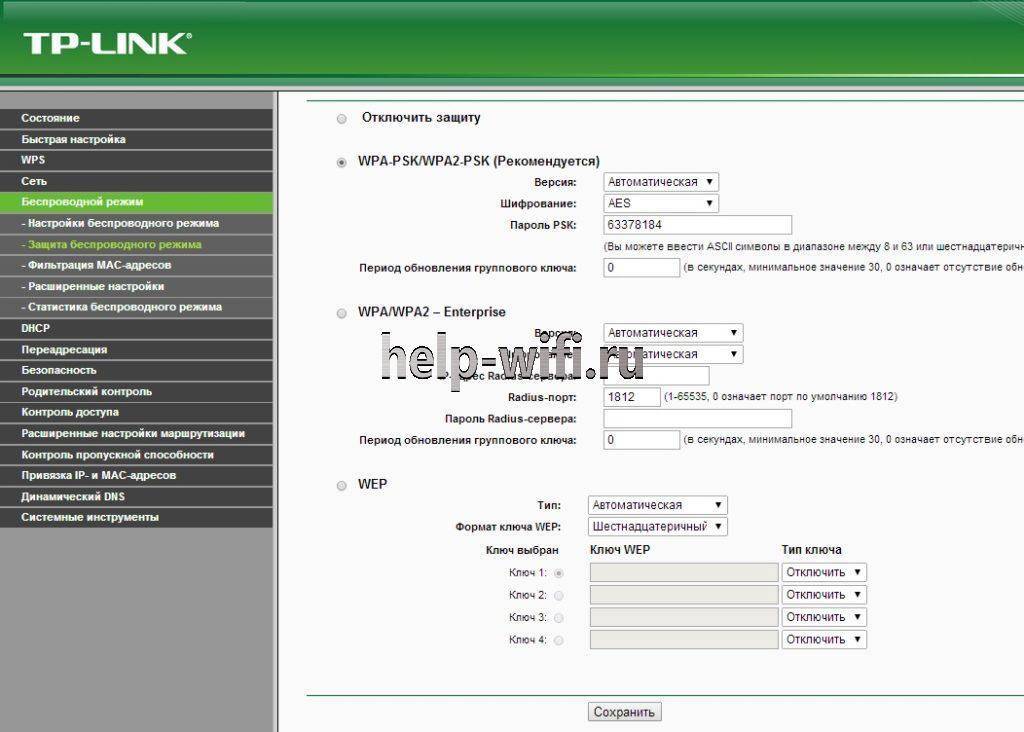 Чтобы определить пароль от Wi-Fi, нужно в левом меню выбрать строку «Беспроводной режим» и затем в открывшемся подменю кликнуть по пункту «Защита беспроводного режима».