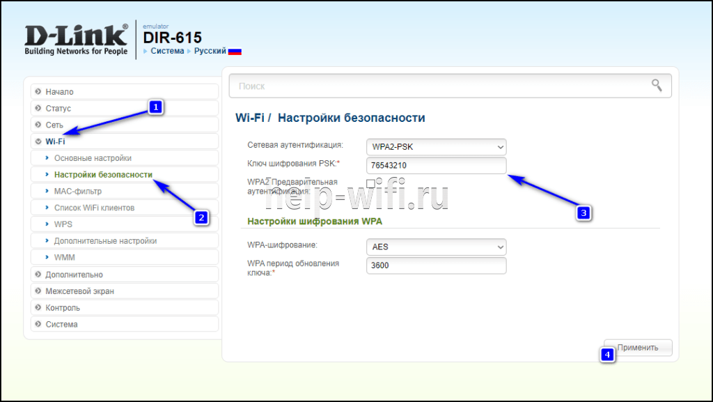 Где посмотреть ключ вайфай на маршрутизаторах, продаваемых под брендом D-Link, расскажем на примере распространенной модели DIR-615. В нем, чтобы добраться до пароля, требуется в меню, находящемся в левой части экрана, выбрать строку «Wi-Fi» и щелкнуть по пункту «Настройки безопасности». После этого справа появится окно, в котором в разделе «Ключ шифрования PSK» будет находиться пароль вайфай сети.