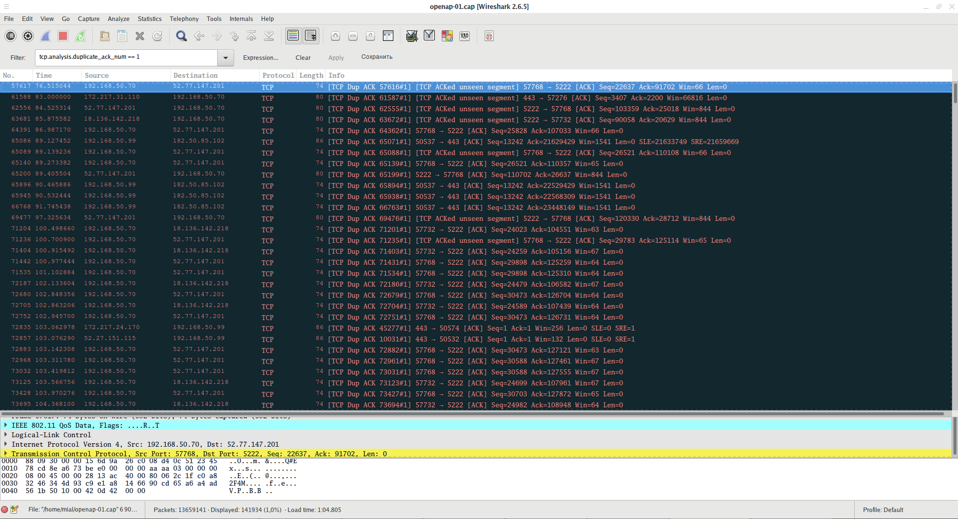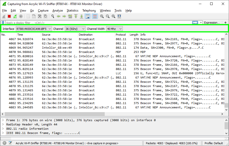 После настройки мы можем начать перехват WiFi сети в Wireshark и получать пакеты.