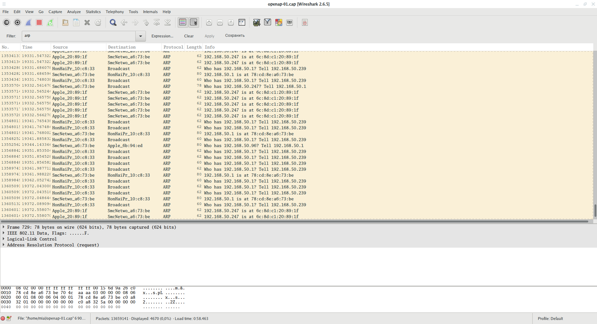 На основании анализа безопасности АRP был сделан вывод о том, что посредством перехвата трафика WiFi широковещательного ARP-запроса на производящем атаку хосте внутри данной области можно организовать отправку ложного ARP-ответа с объявлением себя требуемым хостом (роутером). Это позволяет злоумышленникам брать под контроль трафик того хоста, который дезинформировали, и воздействовать по на него по ранее обговариваемой схеме.