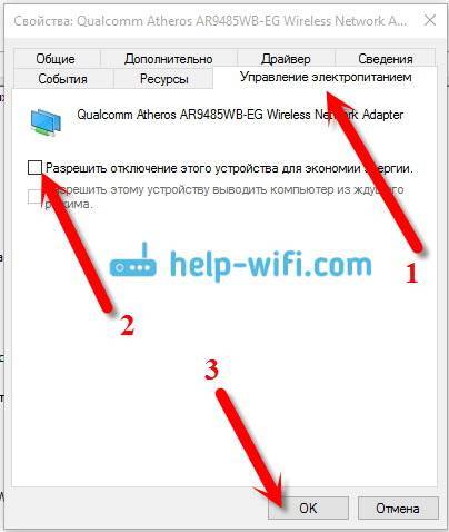 После во вкладке «Управление электропитанием» снимите галочку с пункта «Разрешить отключение этого устройства для экономии энергии». Сохраните настройки и закройте окно.