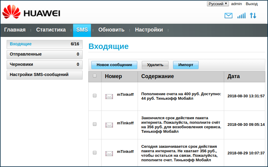 Находясь в интерфейсе модема в меню “SMS” можно посмотреть и удалить СМС-сообщения, которые пришли на ваш номер.