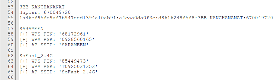 Строки, которые начинаются на , добыты с помощью OneShot, строки, которые начинаются на {“result”:true,”data”:{ добыты с помощью 3WiFi. 3BB-KANCHANANAT подобрал брутфорсом. Большая часть паролей собрана минут за 20-30.