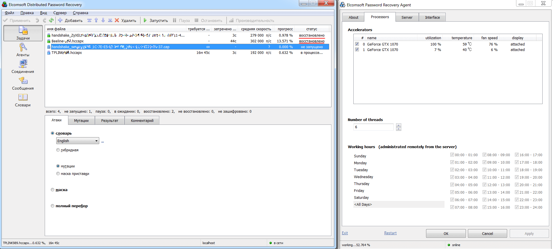 Еще один интересный вариант — использовать сеть распределенных вычислений. Сделать это позволяет, например, Elcomsoft Distributed Password Recovery. Эта универсальная программа понимает десятки форматов паролей и хешей, включая .cap, .pcap и .hccapx. Над одной задачей в ней одновременно могут работать до десяти тысяч компьютеров, объединяя ресурсы своих процессоров и видеокарт.