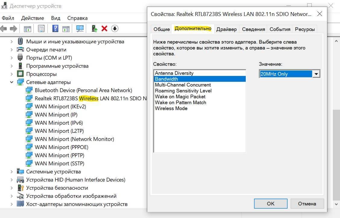 Настройки региона вашего адаптера Wi-Fi должны соответствовать настройкам вашего маршрутизатора Wi-Fi, иначе ваш ноутбук не сможет найти беспроводную сеть. Также, можно изменить параметры частоты. Нажмите Win+R и введите devmgmt.msc,чтобы открыть снова диспетчер устройств. Разверните список сетевых адаптеров и нажвите два раза по беспроводному. Далее перейдите во вкладку «Дополнительно«, и начнем. Если у вас есть Bandwidth, то попробуйте установить значение 20 MHz Only. Если у вас нет его, а есть 802.11n channel width for 2.4GHz, то поменяйте его на 20 MHz Only.