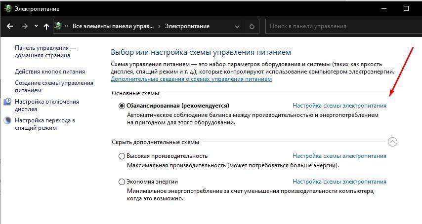 - Откройте «Настройку схемы электропитания», расположенную справа.
