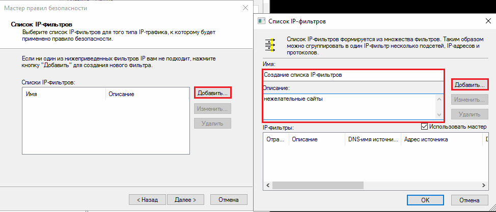 В «Списке IP-фильтров» (их только предстоит создать) кликните «Добавить». Следом — дайте вашему списку имя и снова нажмите «Добавить». Запустится третий Мастер — IP-фильтров.